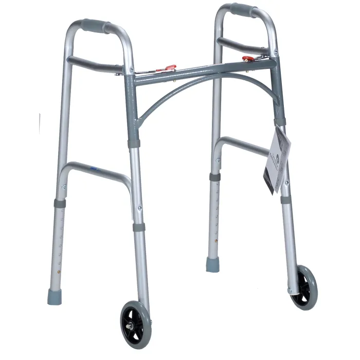 The Dynarex TwoButton Walker with Wheels are a safe, dependable solution for those who need a convenient aid while performing daily activities. These walkers are constructed with a sturdy 1inch aluminum diameter structure, inclusive of 5inch front wheels, this walker can be used to move over most surfaces, as well as, contoured handgrips for added patient comfort. The toolfree button allows for height adjustments, raising and lowering the walker to accommodate any individual. Sturdy aluminum frame Equipped with contoured hand grips Opens and closes with pushbutton mechanism Weight capacity 300350 lb.