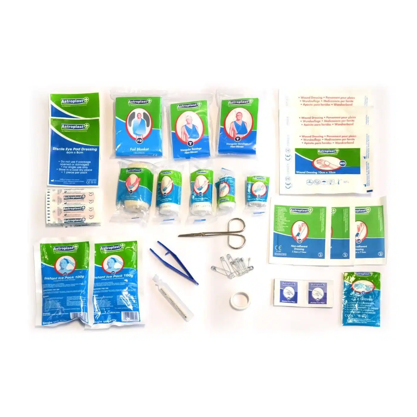 Astroplast First Aid Kit 90 PieceNylon pouch Metal Scissors 11.5cmTriangular bandage Sterile eye pad dressing 68cmIce pack Nonadherent dressing 7.5cm7.5cmSurgical tape Pe plaster 1972mmEye pod Pe plaster 1040mmAdhesive wound dressing Knuckle fabric 7638mmVinyl Gloves 2pcs Fingertip fabric 7645mmConforming bandage 5cm3.6 Safety pins 12pcsConforming bandage 7.5cm4.5 Plastic tweezersCrepe bandage 7.5cm4.5 Foil blanket 130210cmAlcohol wipes