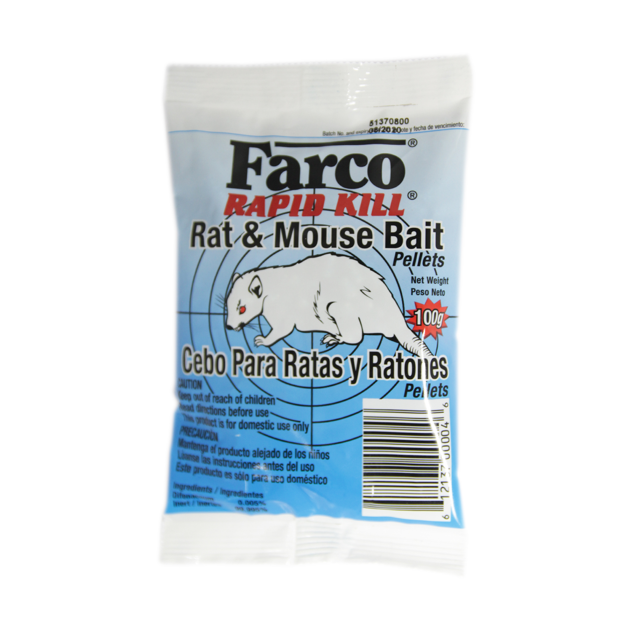 Farco Rapid Kill pellet bait is readyforuse and formulated using a blend of cereals, sugars, proteins and fats, with taste adjuvants to improve bait take.Pellet bait offers an extremely well balanced food supply, and is ideal where the target rodent population has been feeding on compound feedstuffs.Farco Rapid Kill pellet Bait is highly palatable and effective against all pest rodents. Pellet bait offers an extremely long shelflife and can be used indoors and outdoors if well protected from moisture.