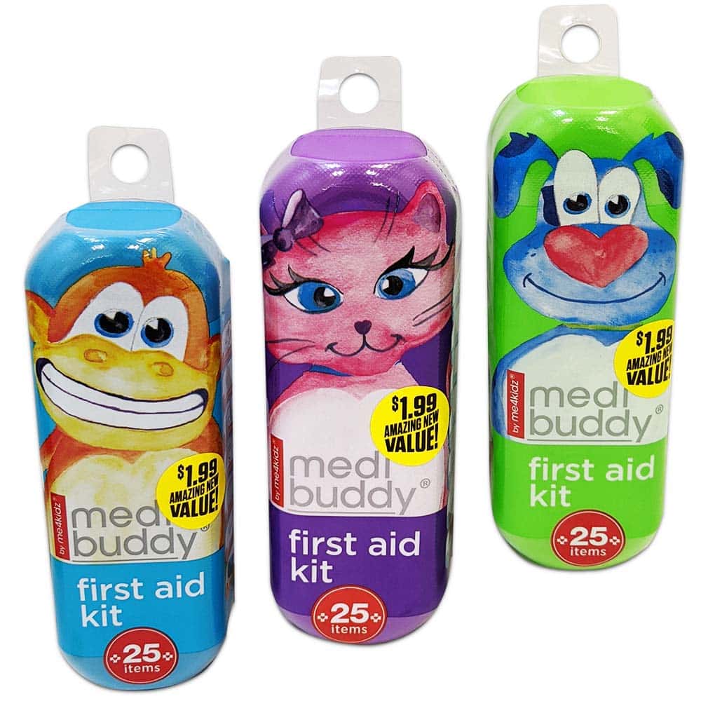 This first aid kit set contains 25 items. The bandages are latex free. Great for backpacks, gym lockers, purse, glove box, baby bag…the list is long. It’s a must have for on the go families and kids.