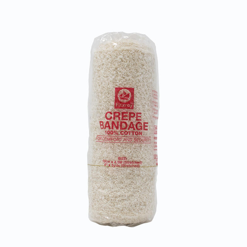 Fitzroy Crepe Bandages 15cmx4mcan be used as compression to relieve swelling and aching legs caused by Varicose Veins, as support for weak ankles, knees and wrists, or for sprains, strains or as a general support. Can be washed and reused.